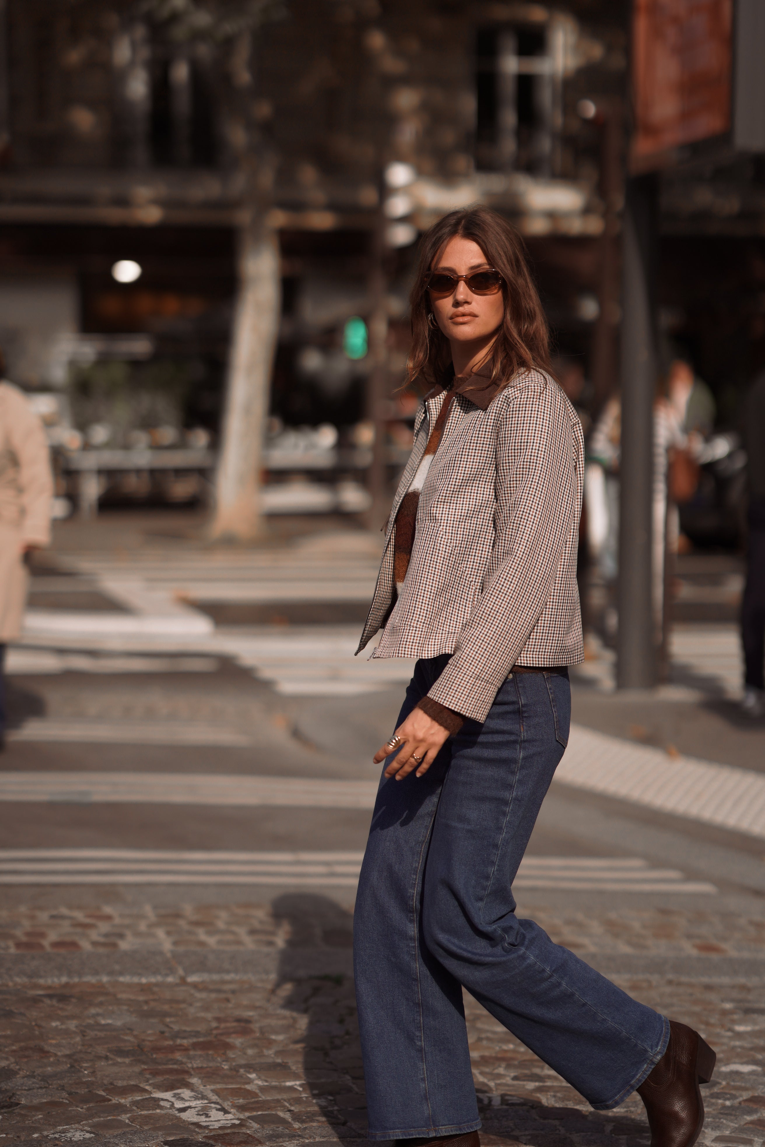 La veste Sasha, la pièce à l’esprit rétro qui coche toutes les bonnes cases cette saison. Son motif à petits carreaux et son col en velours côtelé contrastant lui donnent un côté vintage revisité, tandis que sa coupe droite et sa fermeture zippée en font une veste à la fois cool et structurée.